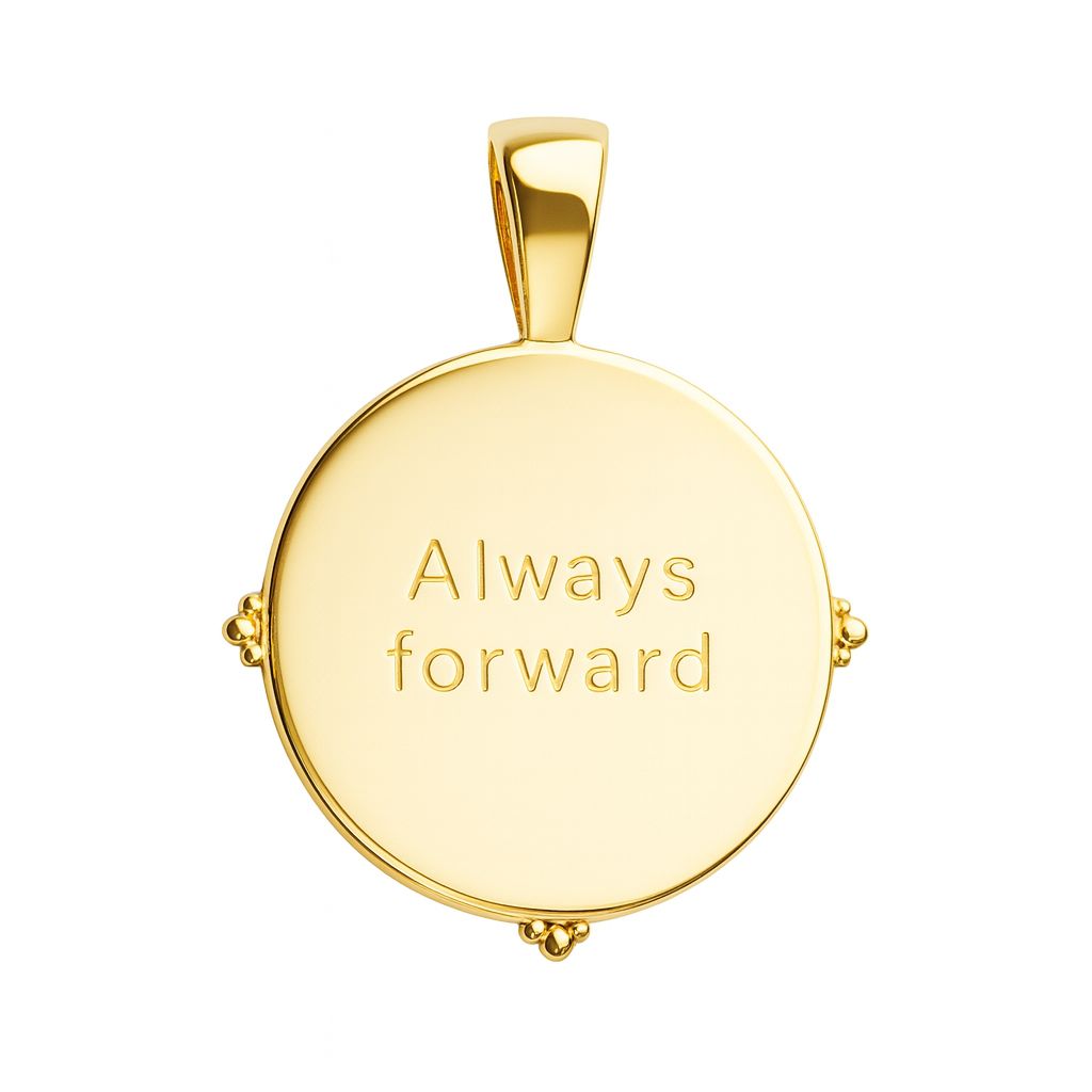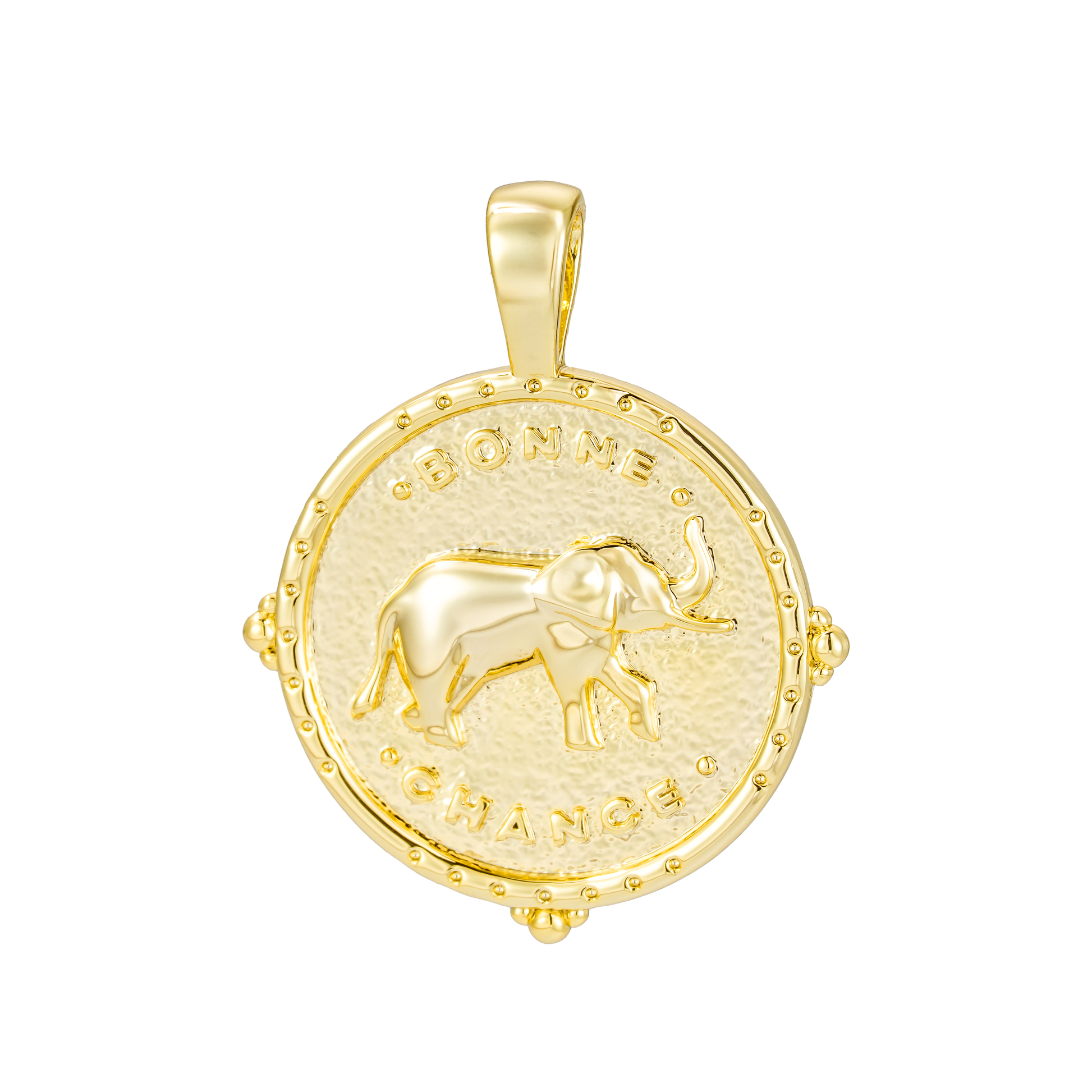 Expertly crafted from brass with a 14k gold bath, this Bonne Chance Charm pendant exudes elegance and sophistication. With a French-inspired design, it symbolizes good luck and the importance of always moving forward. Carry this charm with you for a touch of positivity and style in your daily life.