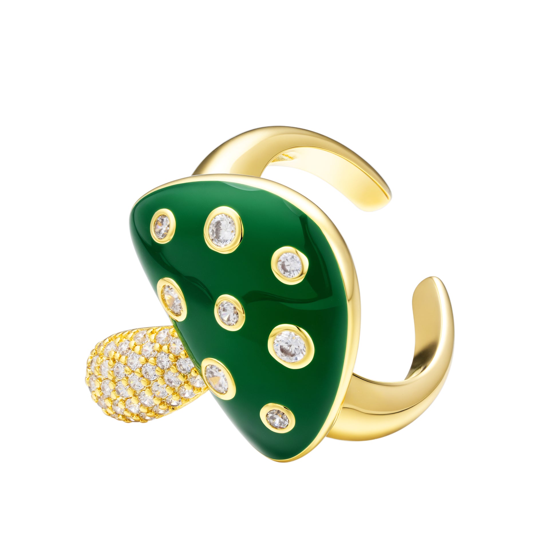 This enamel green mushroom ring features a resizable design and is adorned with a sparkling CZ stone. Expertly crafted with dark green enamel, this ring adds a touch of elegance to any outfit. Its versatility and stylish appearance make it a must-have piece for any jewelry collection.