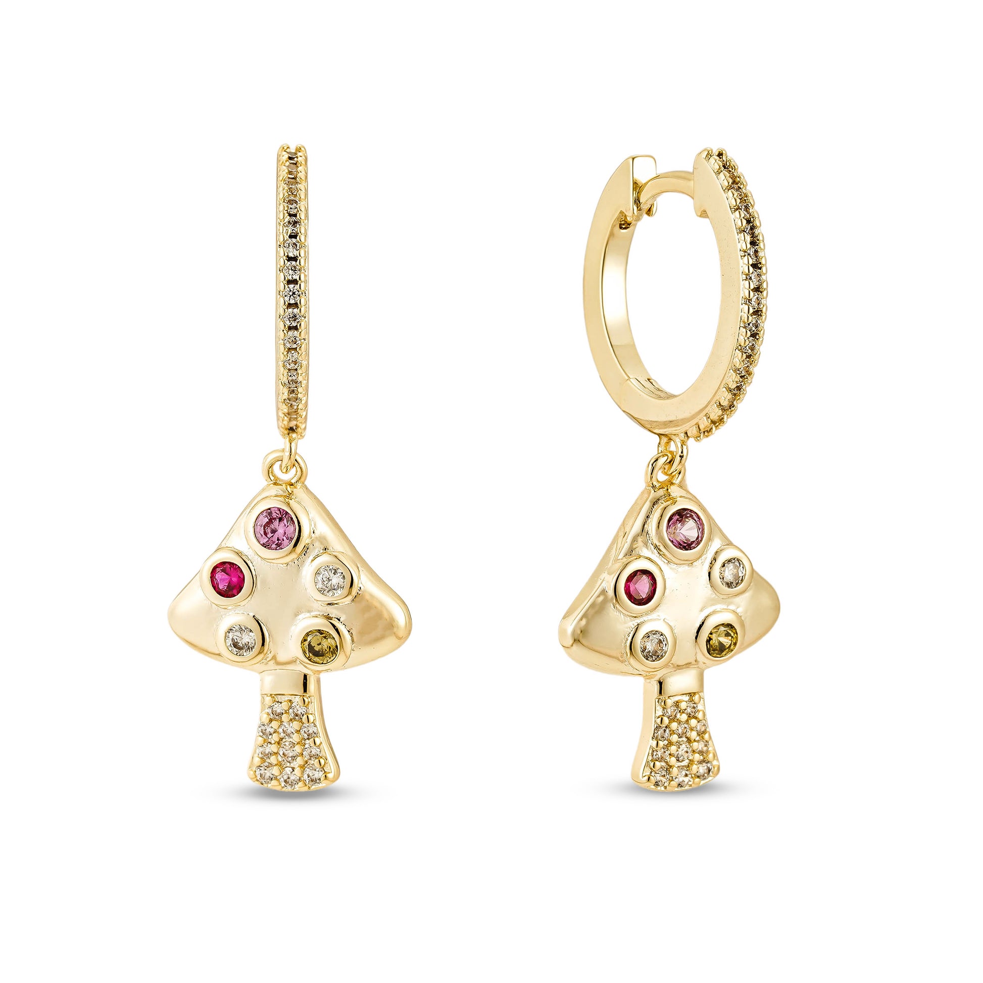 Be a statement with the drop mushrooms. These statement earrings are crafted from brass and bathed in luxurious 14k gold, adorned with sparkling multicolor cz stones for a touch of glamour. Perfect for adding a pop of color to any outfit during summer days.
