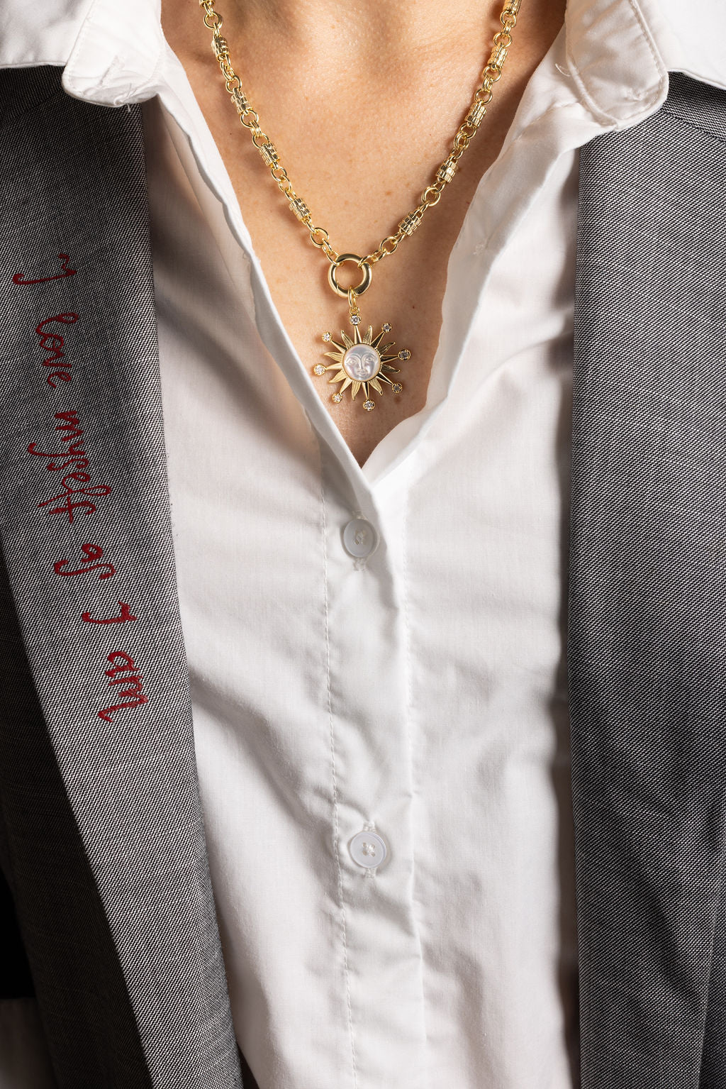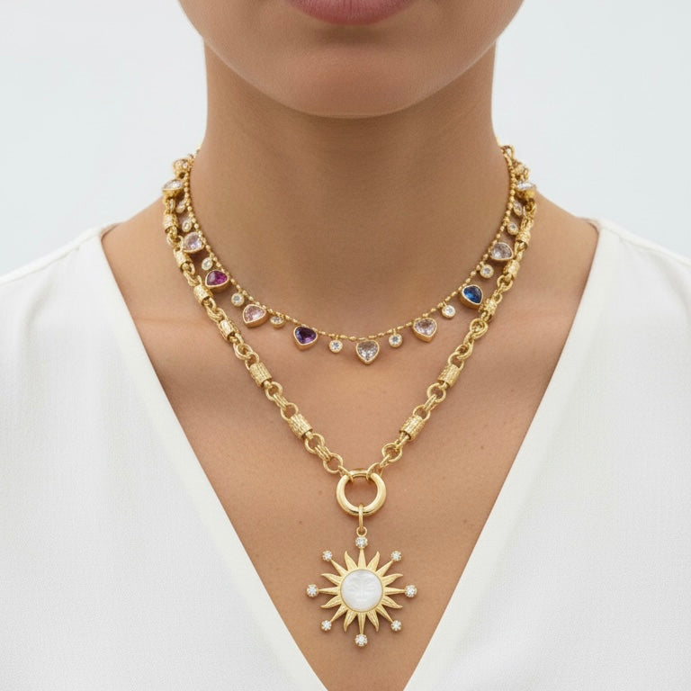 Be stunning this new year with the rebirth of the sun, meaning of the sun in ancient years. Made of mother of pearl, brass and clear cz stones to spark,